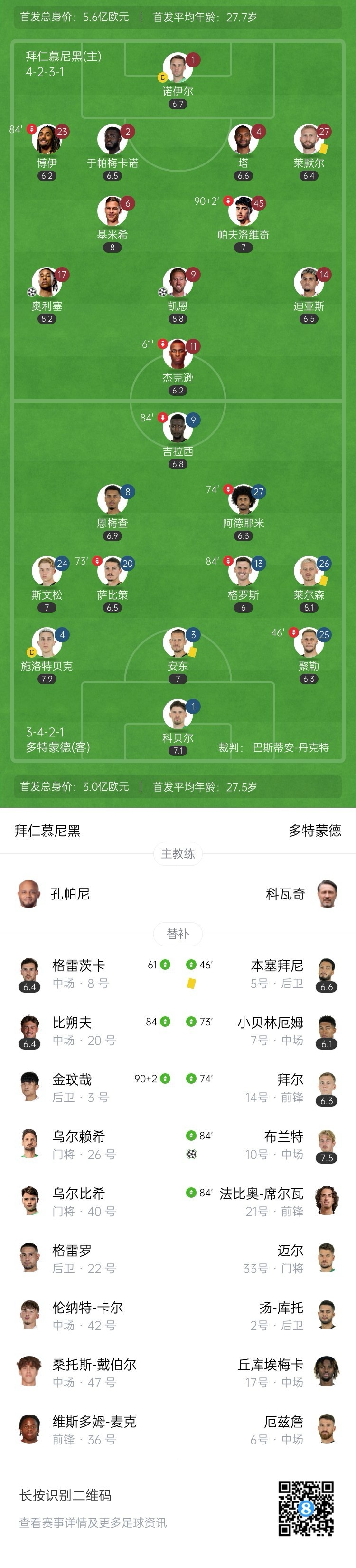 多特扳回一城!布兰特替补破门!第84分钟,莱尔森右路传中,无人盯防的布兰特插上凌空垫射破门,拜仁2-1多特!↓