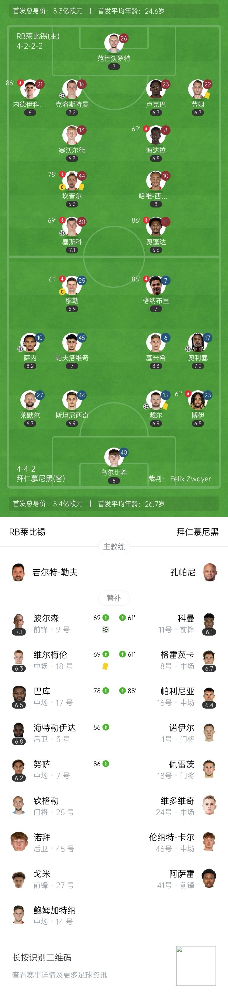 拜仁遭读秒绝平!第90+4分钟,拜仁防守出现空当,哈维-西蒙斯直塞,波尔森插上面对乌尔比希挑射破门,莱比锡3-3拜仁!↓