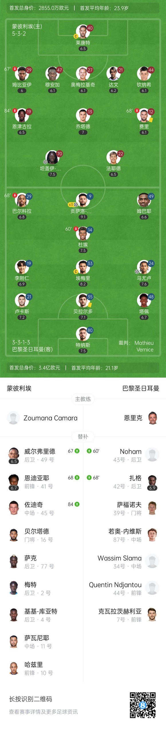 上半场补时2分钟,蒙彼利埃0-1巴黎。