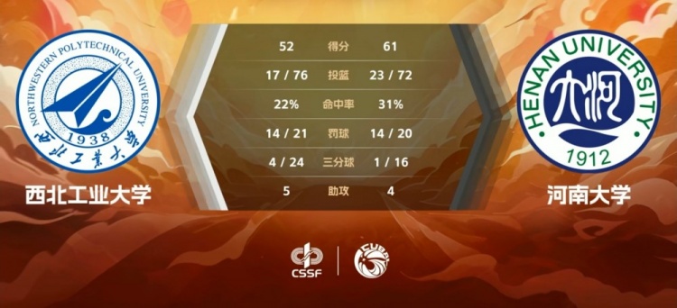 第四节,两队继续缠斗,米卓依靠个人能力冲击内线连续拿分,任天祥带队顽强咬住,双方各自出现24秒违例,米卓关键补篮得手帮助球队保持优势,任天祥三分续命,米卓连投带罚杀死比赛。最终,河南大学61-52力克西北工业大学。
