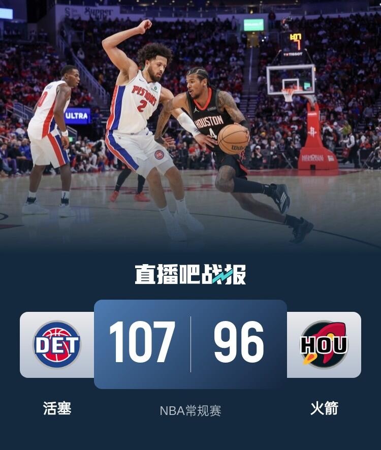 比赛开始,双方开场大打对攻,比分始终紧咬,杰伦-格林连续失误,活塞趁势轰出14-0的攻击波确立优势,次节惠特摩尔挺身而出,三分、暴扣、抢断样样都有,火箭回敬16-0的进攻高潮强势反超,半场战罢双方战成57平。易边再战,火箭突然断电,连续打铁失误,活塞趁势再度获得两位数领先,申京得分助攻一肩挑带队追赶,末节活塞稳扎稳打保持优势,火箭苦苦追赶无果。最终,火箭96-107不敌活塞,主场落败。
