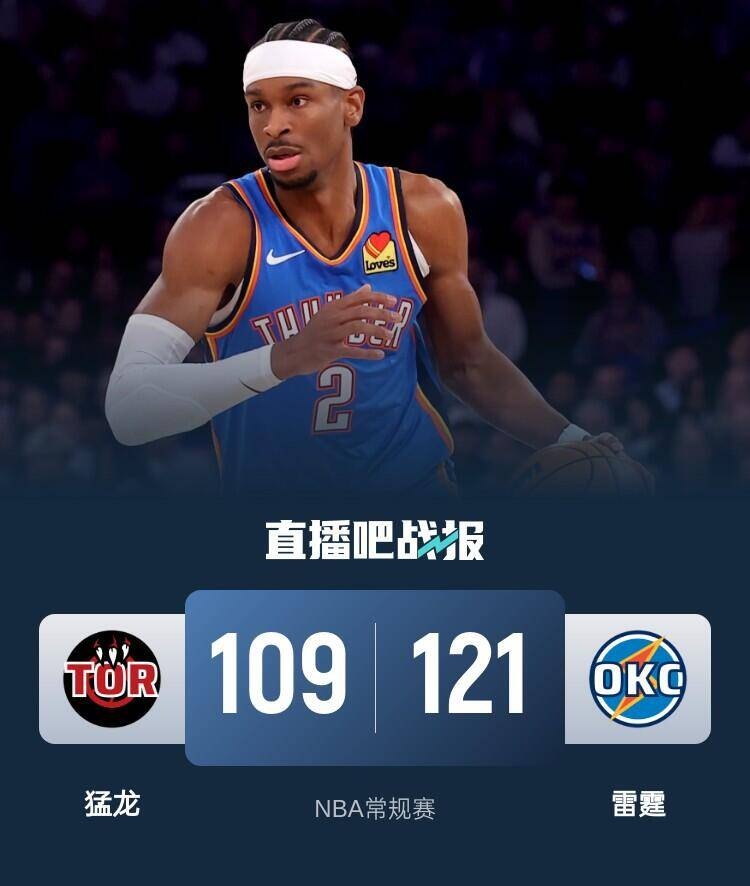 比赛上来,两队打得相对胶着,不过到了首节末段猛龙的进攻突然哑火,雷霆趁势打出一波10-0的小高潮拉开分差,次节猛龙发起反扑连拿九分迫近比分,但雷霆及时给出回应没有给他们反超的机会,半场结束时分差依旧有11分;下半场回来,两队保持拉锯,分差没有发生太多改变,复出的霍姆格伦场上存在感也不是很强,单节再次未得分甚至没有出手,末节猛龙没有再获得任何机会,分差也是进一步突破二十分,最终雷霆轻取猛龙,迎来四连胜的同时也送给后者三连败。