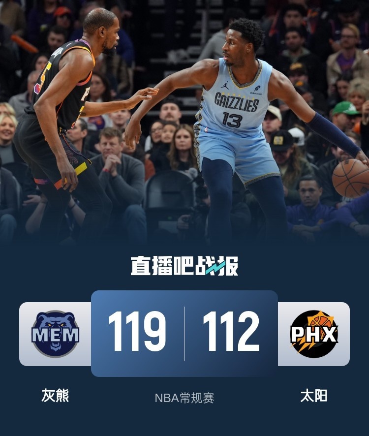 首节之争灰熊反客为主早早进入状态,前期虽然优势不大但一直控制比赛,末段轮换阶段则接管比赛,他们连着4记三分送上一波18-7的攻势一举拉开两位数分差;次节杜兰特虽然砍下17分但球队防守端才是症结所在,灰熊虽然没有绝对高分但多点开花无视防守稳定输出,他们半场送出18次助攻足见进攻端的流畅度并带着12分领先进入下半场。休息归来灰熊前期一直占据上风一度拉开18分的领先,不过太阳在后半段逐渐起势蚕食分差,杜兰特第三节命中两记罚球达成个人生涯第三万分里程碑;末节决胜太阳两次追至4分但都没能再进一步,灰熊则连续关键球得分顶住压力并守住胜利。最终,灰熊客场击败太阳拿下比赛。
