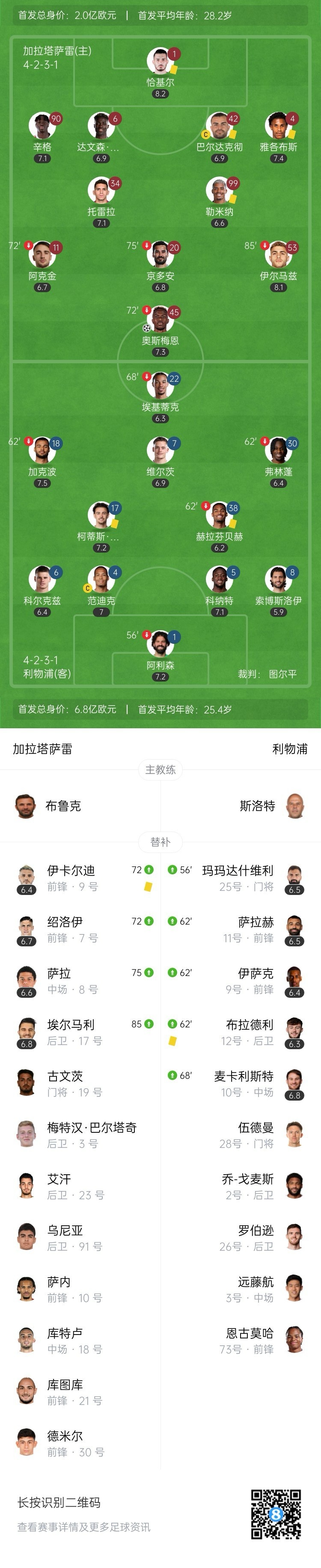 10月1日讯 北京时间10月1日凌晨3时,欧冠联赛阶段第2轮,利物浦做客土耳其电信球场对阵加拉塔萨雷。上半场,索博斯洛伊犯规送点,奥斯梅恩主罚点球命中,加克波错失一次绝佳良机。利物浦半场0-1落后加拉塔萨雷。下半场,阿利森、埃基蒂克因伤被换下。最终利物浦0-1不敌加拉塔萨雷,各赛事遭遇两连败。