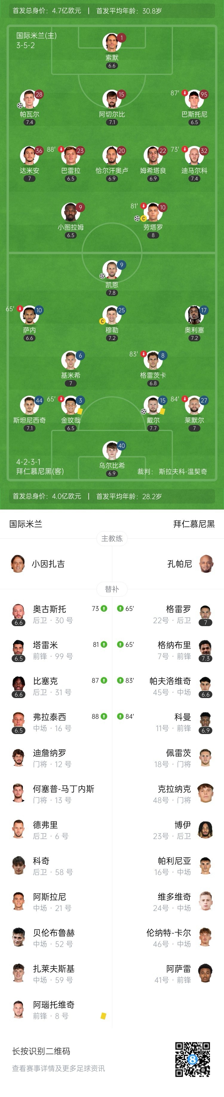 帕瓦尔弑旧主+国米生涯首球!国米总比分2球领先!第61分钟,恰尔汗奥卢主罚角球传中,帕瓦尔力压金玟哉抢点头球得分,同样进行疯狂庆祝,国米2-1拜仁!总比分国米4-2拜仁!↓