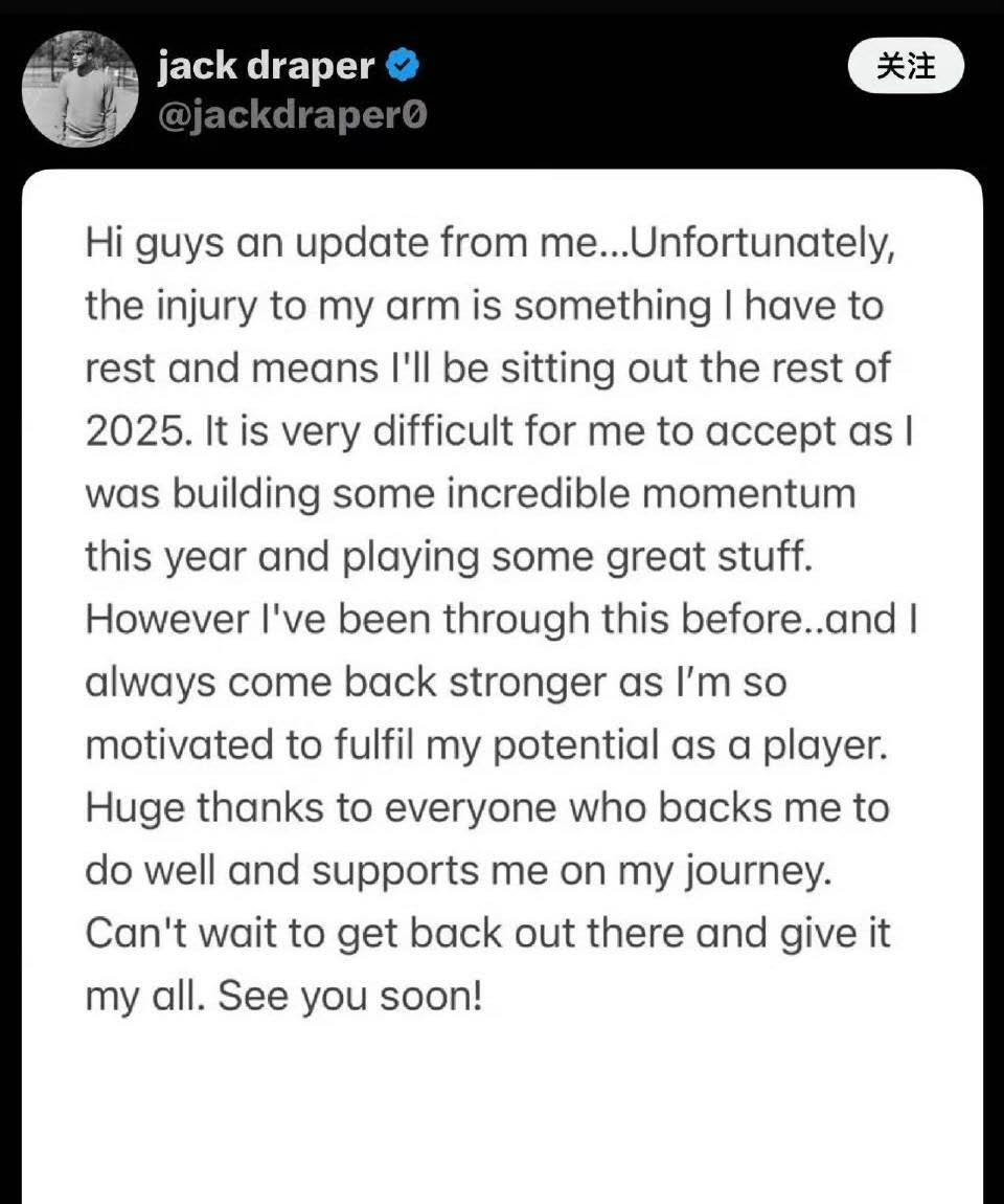 此外,世界排名第七的英国网球名将杰克·德雷珀于9月9日通过个人社交平台宣布,因手臂伤势未愈,将退出2025赛季所有剩余赛事。这位刚在印第安维尔斯大师赛夺得生涯最重要冠军的英国一哥无奈表示:“这个决定非常艰难。今年我积累了出色的状态并打出了精彩的比赛内容。”