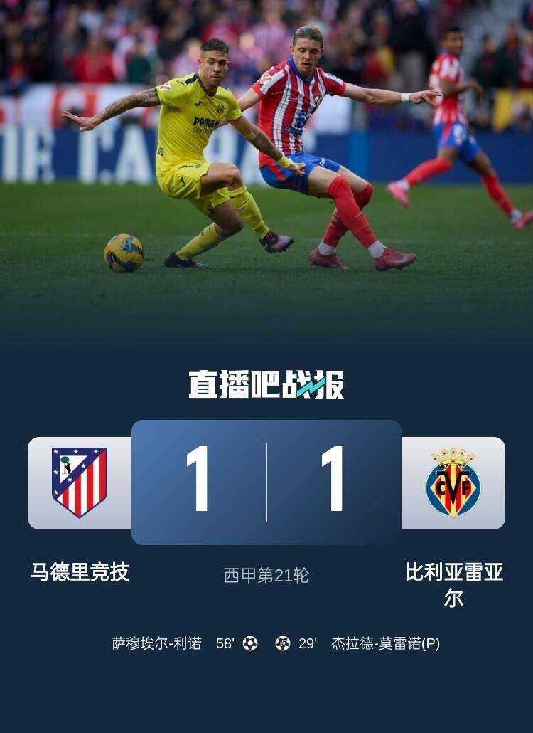 全场比赛结束,马德里竞技1-1比利亚雷亚尔。