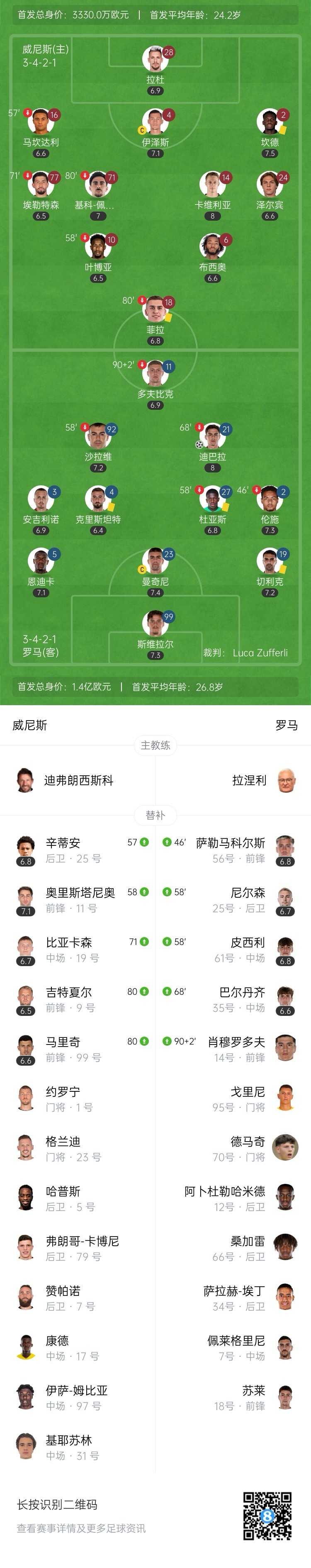全场比赛结束,罗马1-0击败威尼斯。