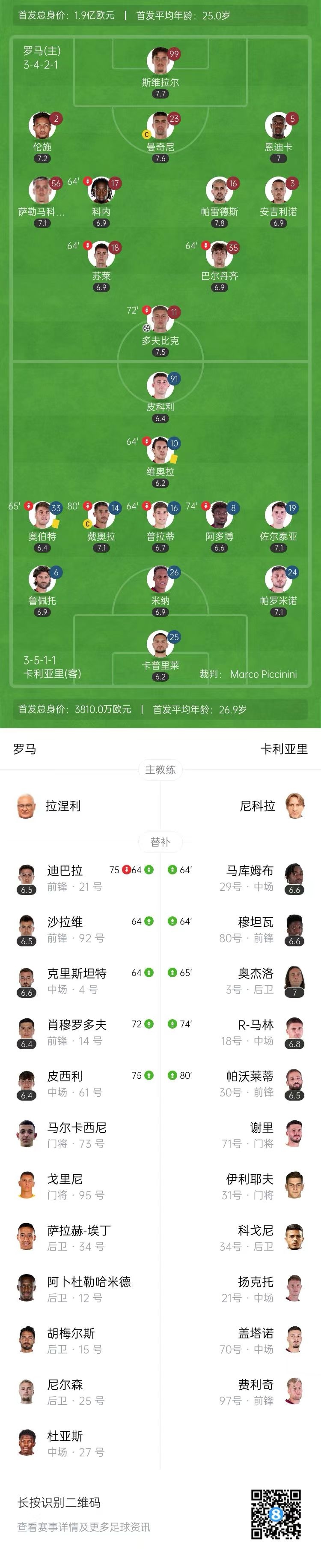 意甲六连胜!罗马1-0卡利亚里升至第七 多夫比克制胜迪巴拉伤退