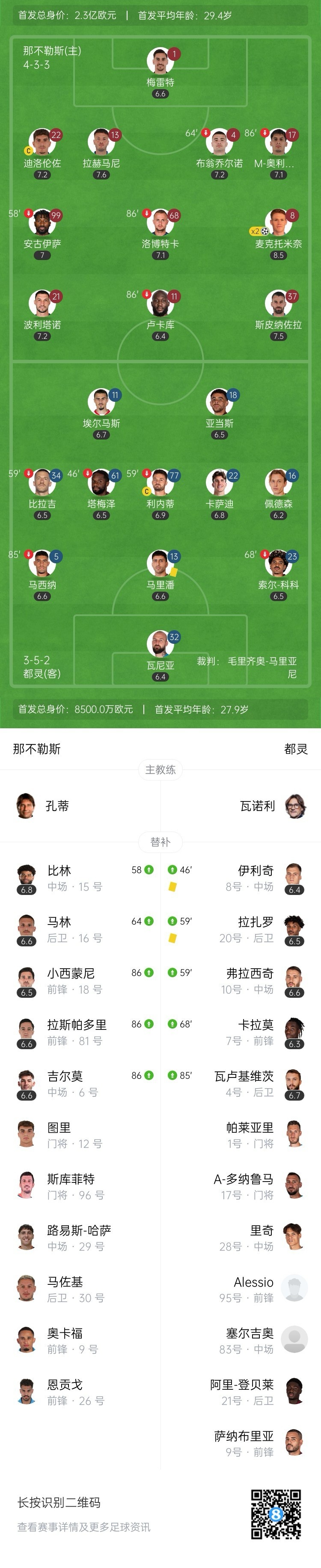 第78分钟,卡拉莫前场左路带球突破,随后高空球斜传到禁区内,队友后点包抄,那不勒斯球员抢先将球解围!↓