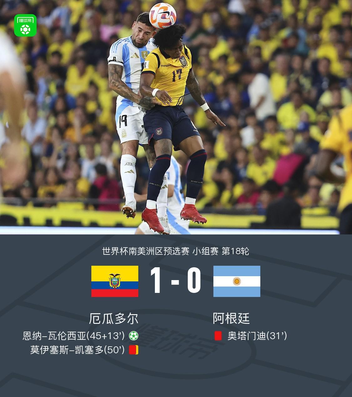 北京时间9月10日,世界杯南美洲区预选赛小组赛第18轮,厄瓜多尔对阵阿根廷。比赛第31分钟,阿根廷球员奥塔门迪因累计两张黄牌被红牌罚下。上半场补时第13分钟,厄瓜多尔球员恩纳-瓦伦西亚主罚点球命中,帮助球队取得领先。第50分钟,厄瓜多尔球员莫伊塞斯-凯塞多吃到第二张黄牌被罚下场。最终,厄瓜多尔以1比0战胜阿根廷。