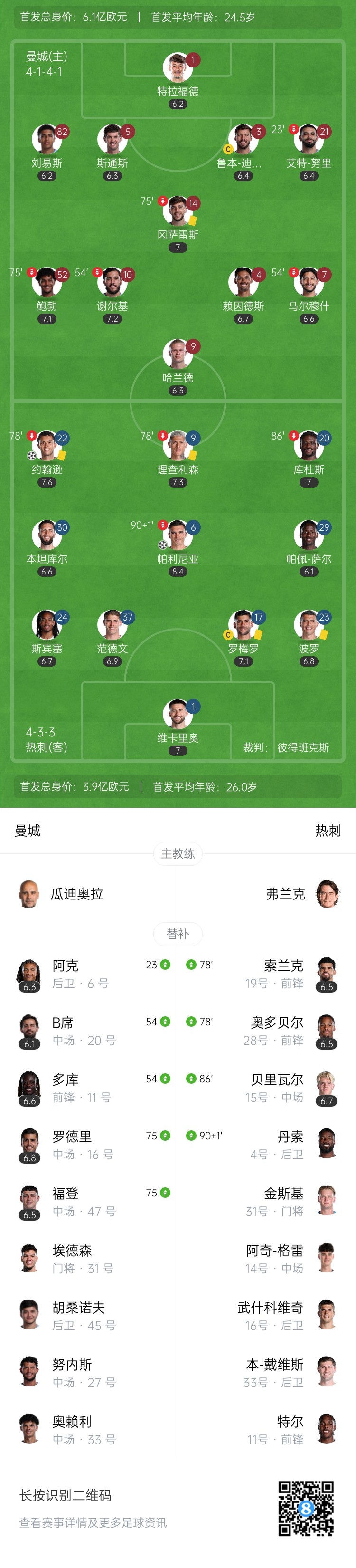 第53分钟,热刺禁区内失误被断球,但是曼城未能把握机会↓