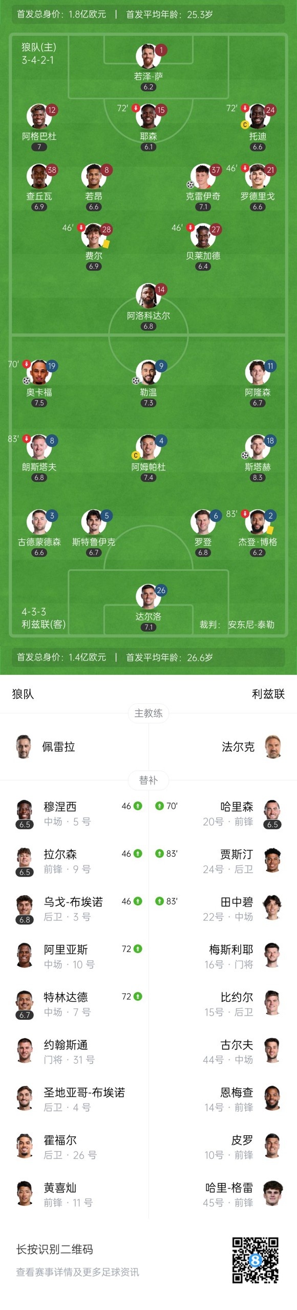下半场补时4分钟,狼队1-3利兹联。