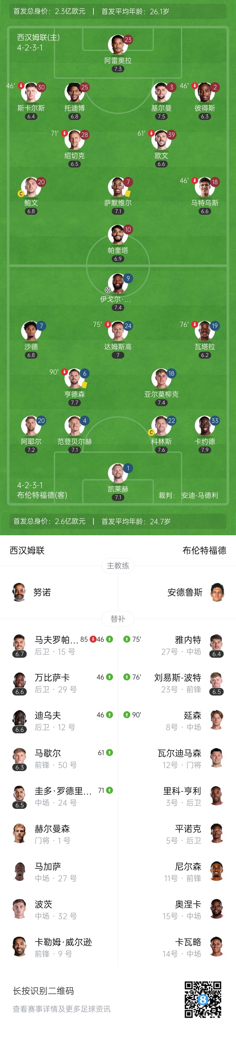 第90+4分钟,门将凯莱赫大脚策动进攻,刘易斯-波特下底回做助攻,延森稍作调整爆射入网,布伦特福德2-0锁定胜局↓