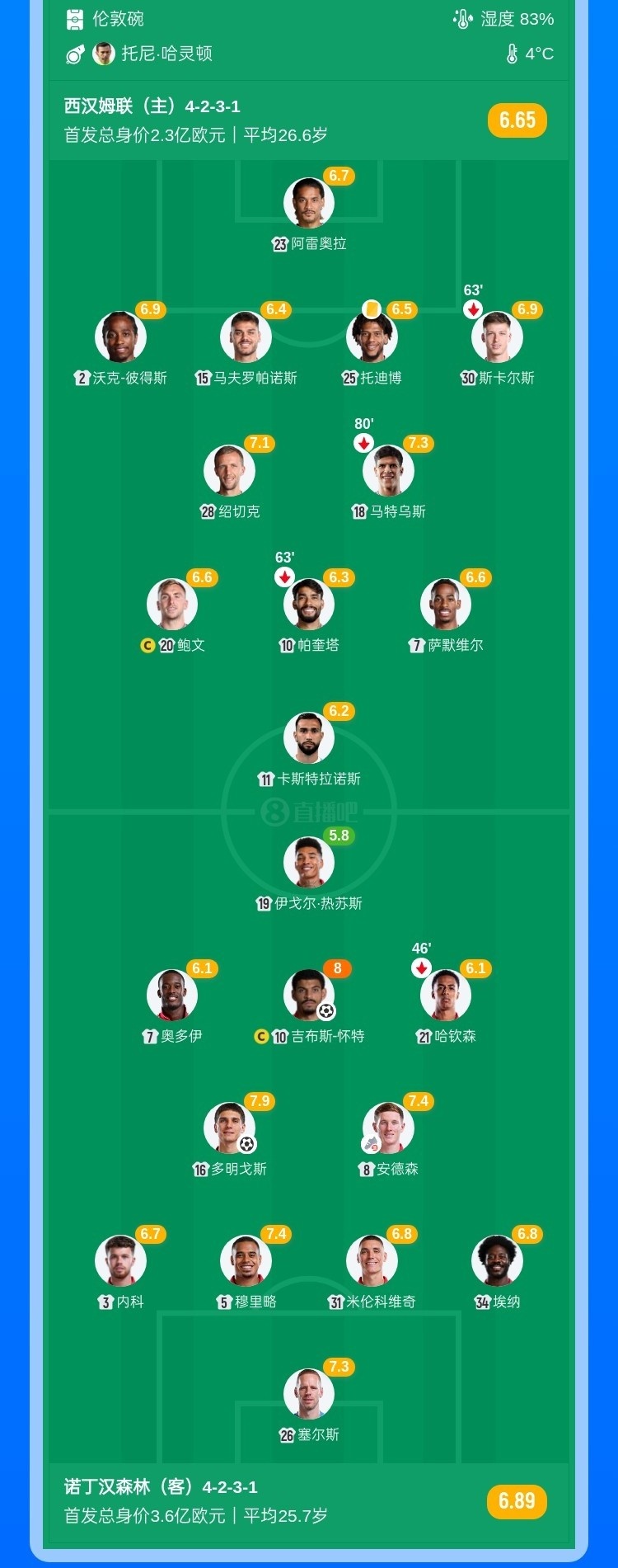 下半场补时7分钟。最终全场比赛结束,西汉姆1-2诺丁汉森林。