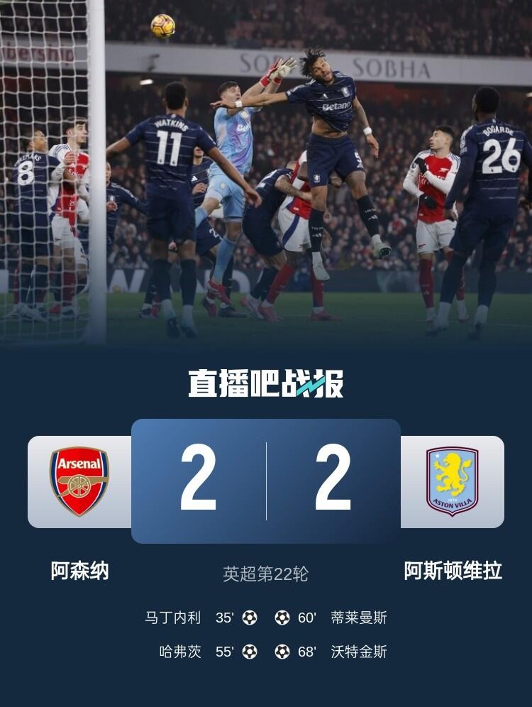 1月19日讯 英超第22轮,阿森纳主场对阵维拉,比赛在酋长球场打响。上半场,特罗萨德传中助马丁内利打破僵局。下半场,又是特罗萨德的传中,哈弗茨破门;蒂莱曼斯鱼跃冲顶迅速扳回一球;随后哈弗茨冒顶,沃特金斯凌空扳平比分;终场前,梅里诺远射击中哈弗茨手臂变线破门,进球被判无效。最终,阿森纳2-2战平维拉,多赛一场距离榜首的利物浦6分。