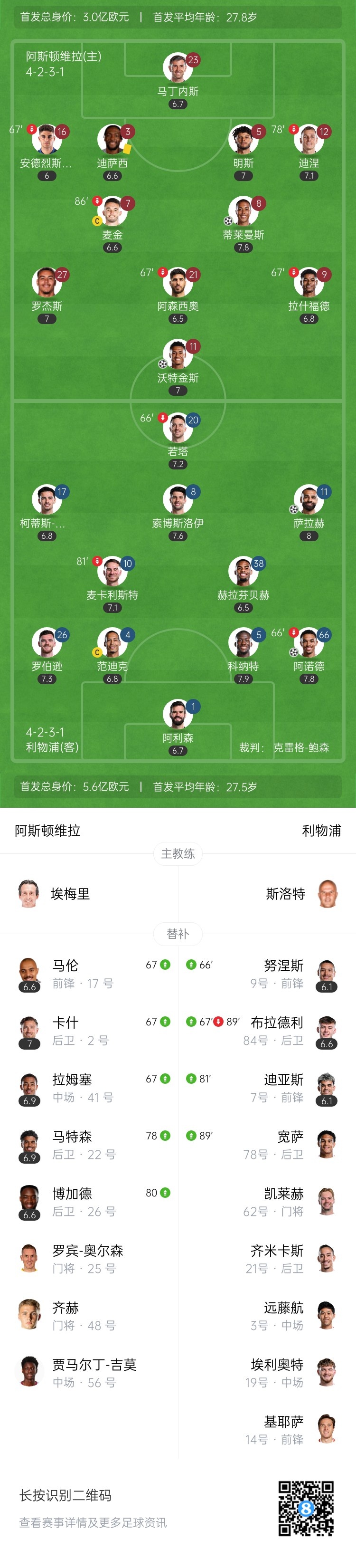 第27分钟,加西亚回传直接被若塔抢断,后者突入禁区送出横传,萨拉赫轻松破门,利物浦1-0维拉。↓
