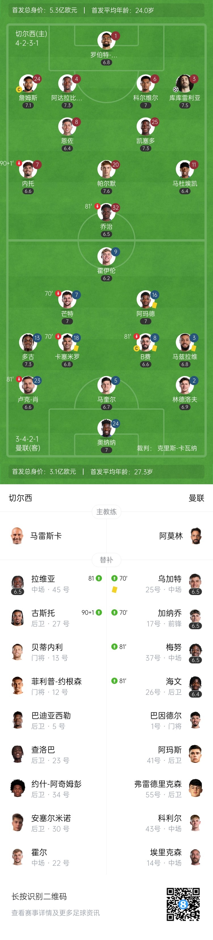 第71分钟,内托右路分球,里斯-詹姆斯马赛回旋摆脱后斜传禁区,后点库库雷利亚头球攻门得手,切尔西1-0曼联。↓