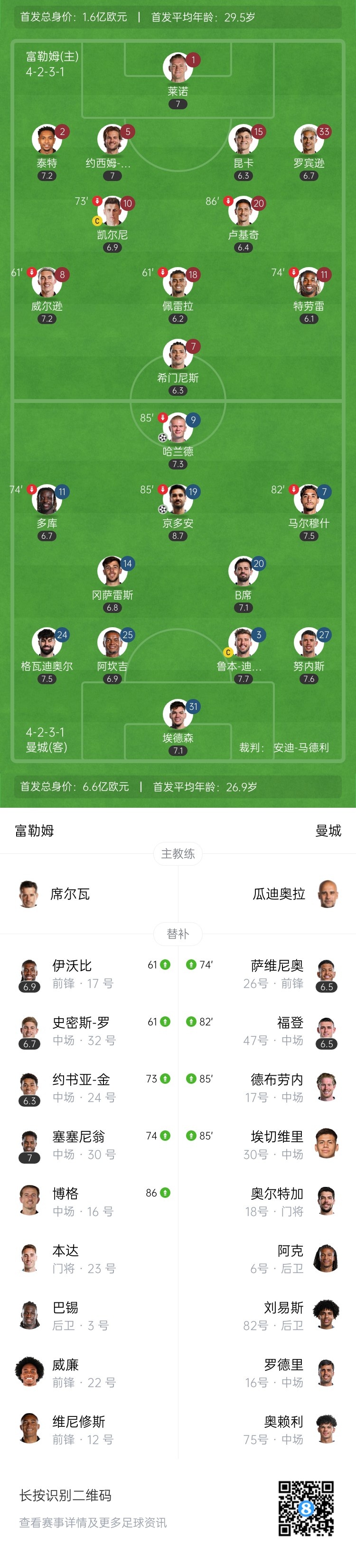 下半场伤停补时4分钟,全场比赛结束,最终曼城2-0富勒姆。