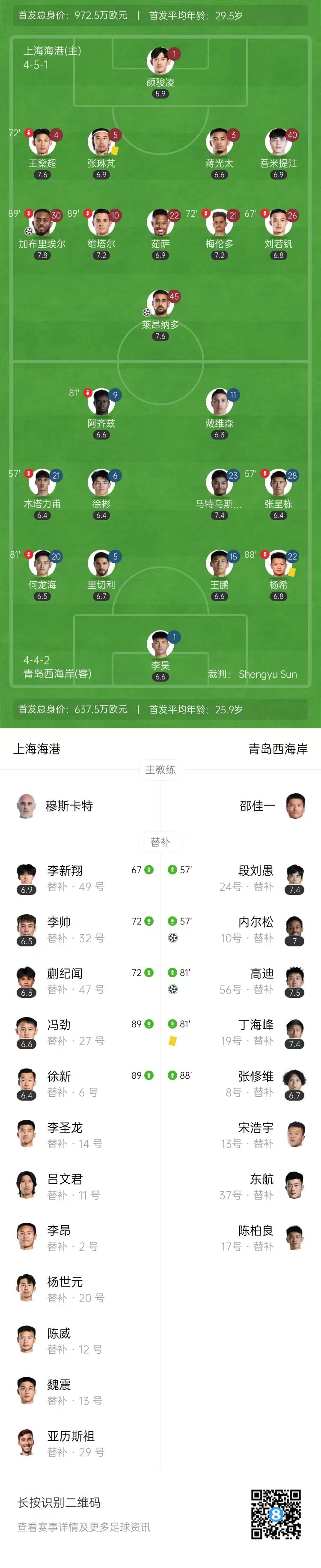 全场比赛结束,上海海港2-2青岛西海岸。