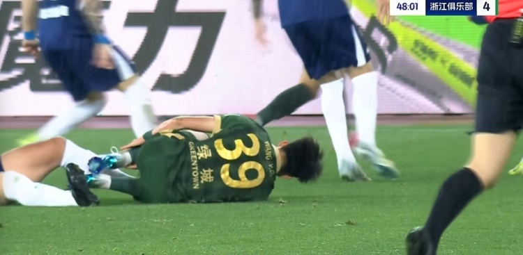 第49分钟,王钰栋拼抢中被郑凯木踩到脚踝后痛苦倒地,担架进场将王钰栋抬出场外,郑凯木被黄牌警告↓