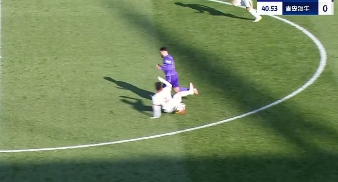 第40分钟,金洋洋中场拦截飞铲踢倒进攻球员,主裁判第一时间出示黄牌。↓