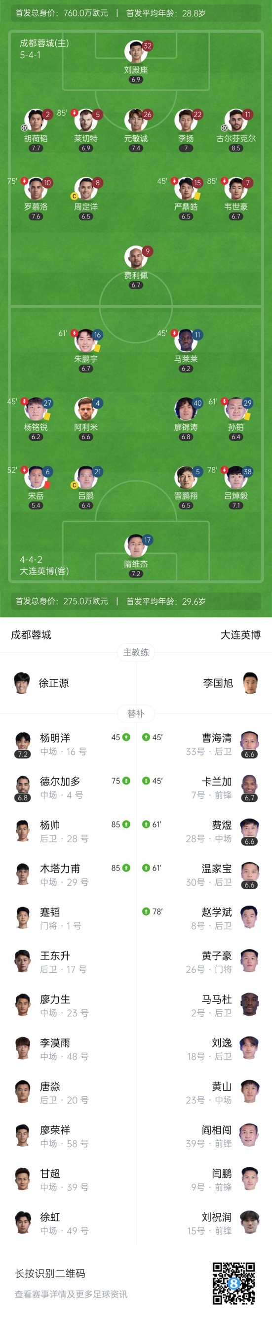 下半场补时3分钟,成都蓉城2-0大连英博。