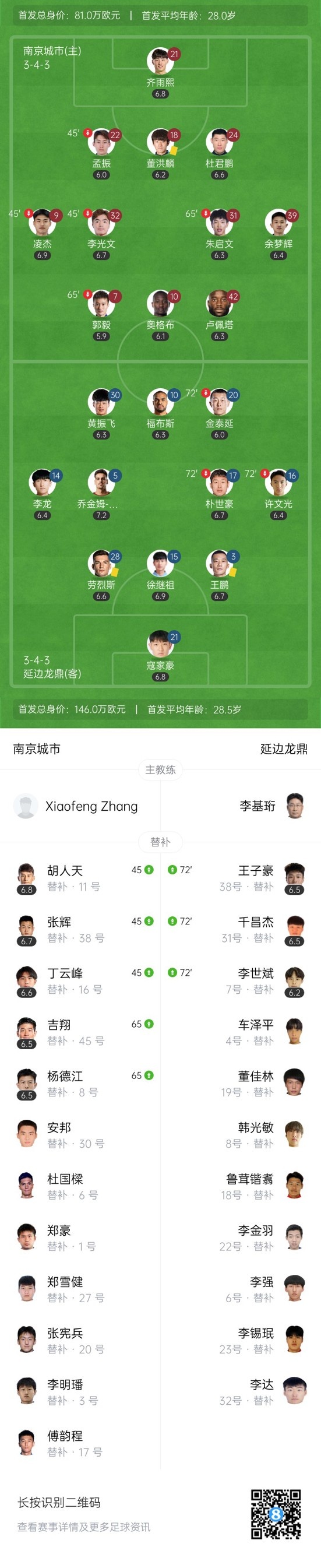 下半场补时7分钟,南京城市1-1延边龙鼎。