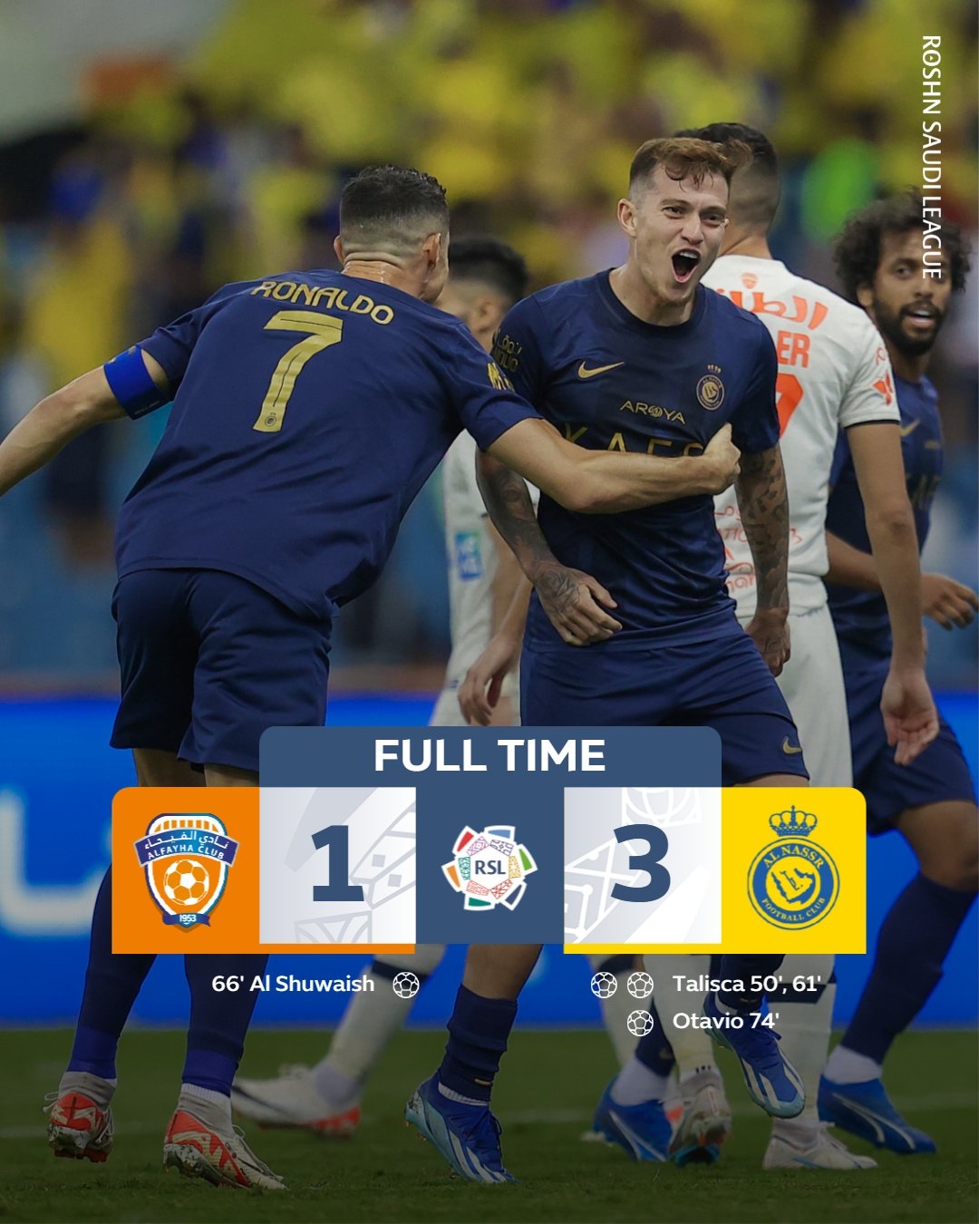 沙特联-利雅得胜利3-1费哈升至第2 塔利斯卡双响C罗献助攻