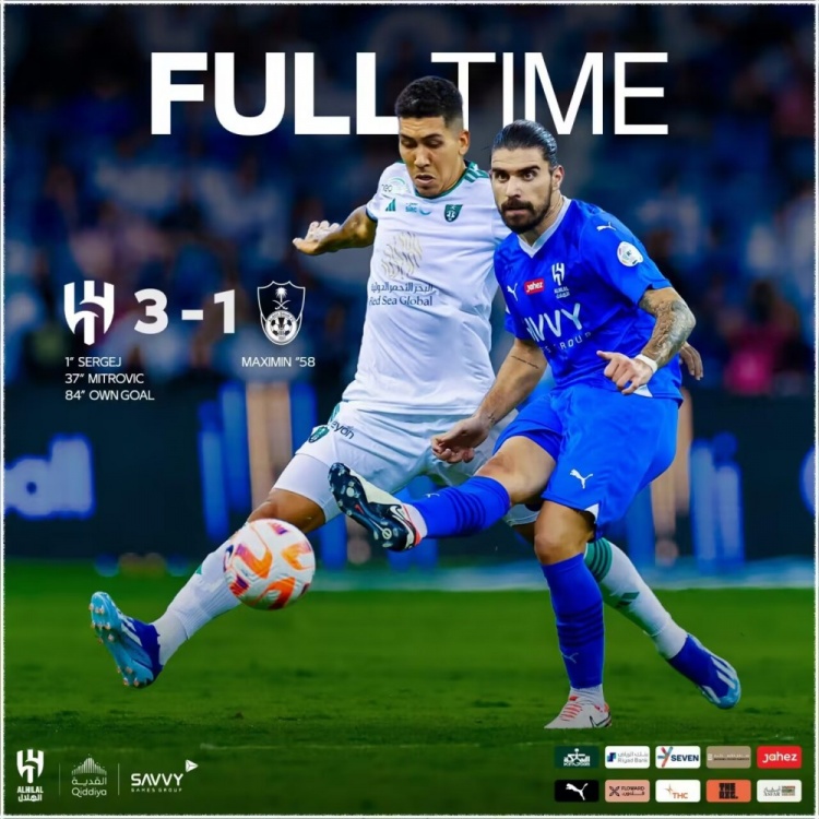 下半场补时4分钟。最终全场比赛结束,利雅得新月3-1吉达国民。