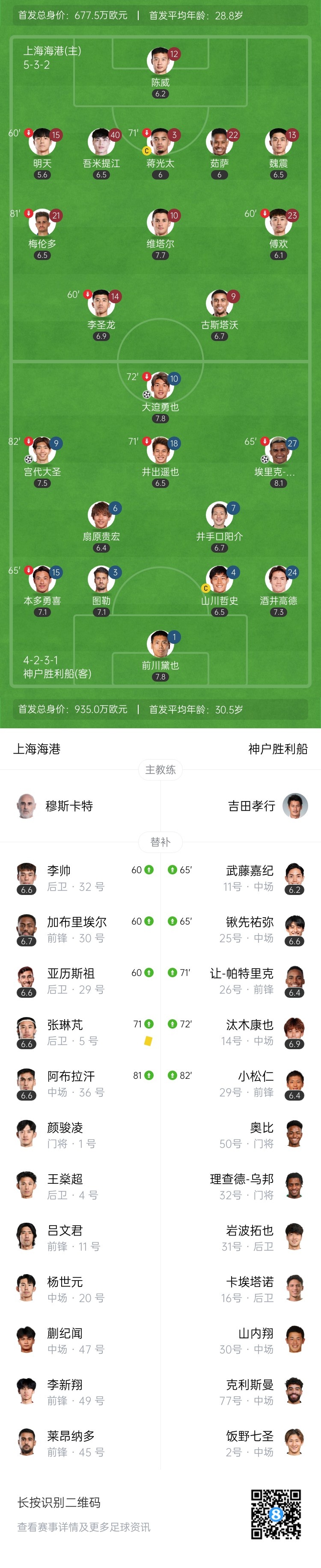 第45分钟,酒井高德插上助攻,禁区内倒三角传球,大迫勇也跟进推射破门,上海海港0-3落后神户胜利船↓
