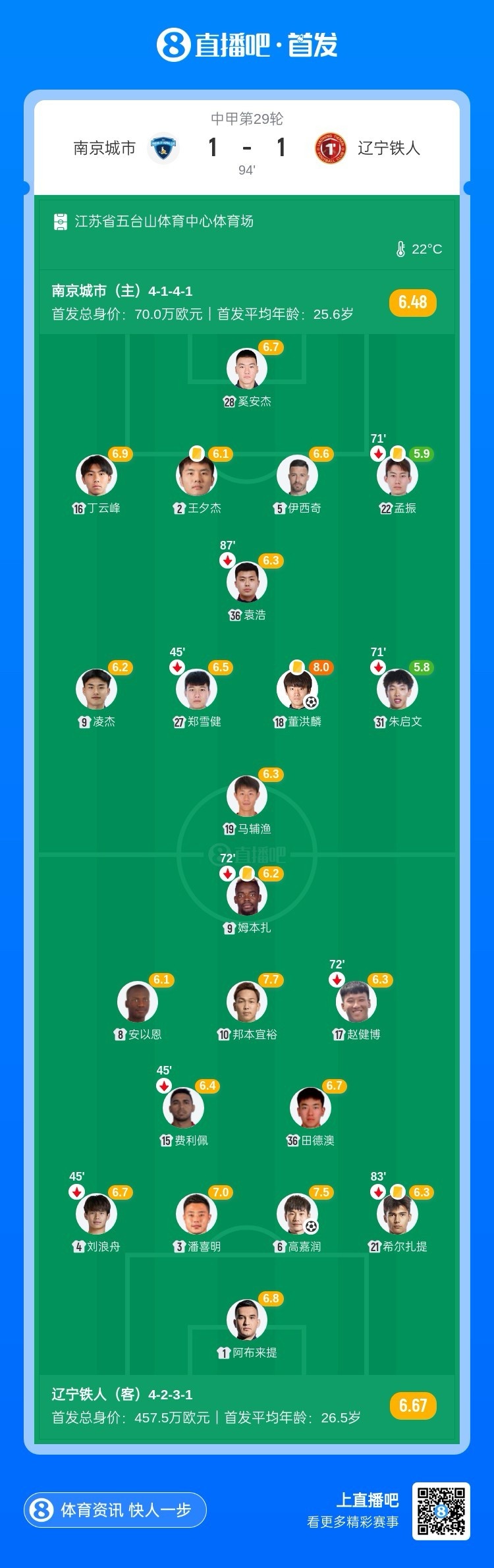 全场比赛结束,辽宁铁人客场1-1战平南京城市。