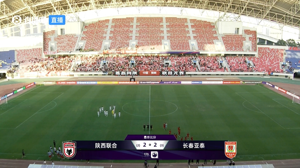 下半场补时4分钟,陕西联合2-2长春亚泰。