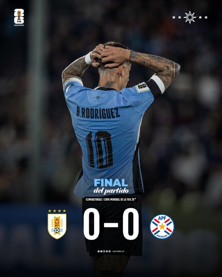 伤停补时6分钟。全场比赛结束,乌拉圭0-0巴拉圭。