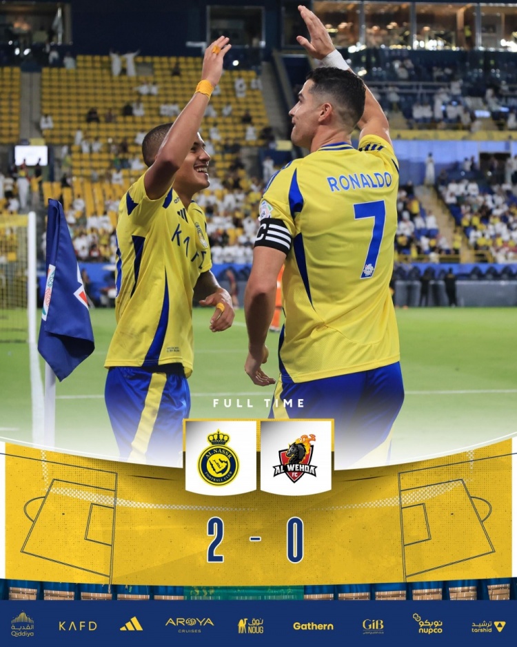 利雅得胜利:24-本托、2-哈纳姆、3-西马坎、27-拉波尔特(84' 4-法蒂尔)、83-萨勒姆-纳吉迪(67' 12-纳瓦夫)、17-哈巴利、25-奥塔维奥(67' 19-哈桑)、80-韦斯利(67' 29-加里卜)、20-安吉洛(84' 23-艾曼-叶海亚)、10-马内、7-C罗