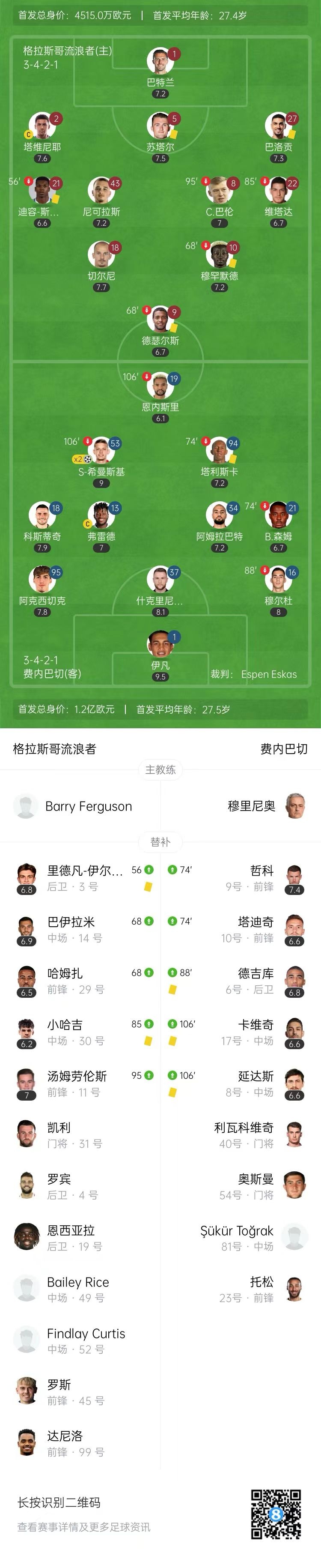 点球大战第5轮,延达斯主罚打飞,费内巴切不敌格拉斯哥流浪者被淘汰!↓