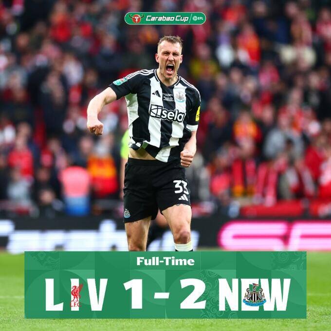 3月17日讯 北京时间3月17日凌晨0:30,英格兰联赛杯决赛在温布利球场打响,利物浦对阵纽卡斯尔。上半场特里皮尔助攻丹-伯恩头球破门,利物浦暂0-1纽卡斯尔;下半场伊萨克破门,补时阶段小基耶萨为利物浦打进1球,最终利物浦1-2纽卡斯尔,无缘卫冕,一周内继欧冠出局后,联赛杯也无缘夺冠;纽卡斯尔则赢下队史首座联赛杯冠军,这也是球队近70年来的第一座奖杯,纽卡上一个国内顶级赛事冠军要追溯到1955年的足总杯,当时他们3-1击败曼城夺冠。