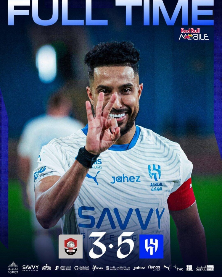 第77分钟,多萨里反击中左路得球沿底线内切后兜射完成帽子戏法,利雅得新月5-2布赖代先锋。↓