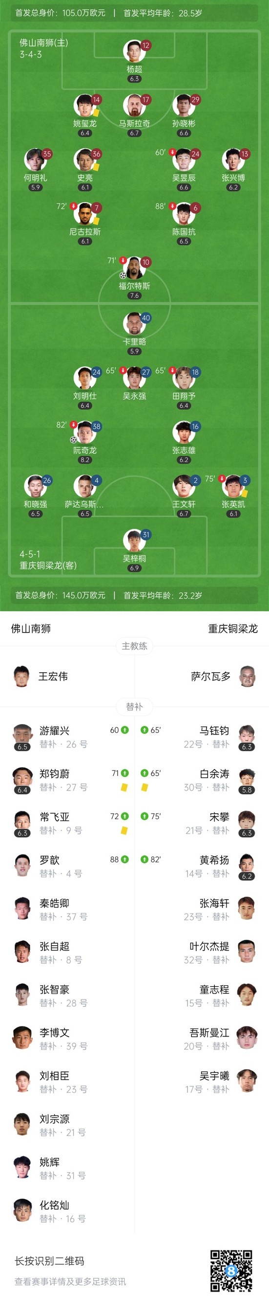 第5分钟,佛山南狮闪击得手!右路定位球开到禁区门前福尔特斯高高跃起头球破门,佛山南狮1-0重庆铜梁龙。↓