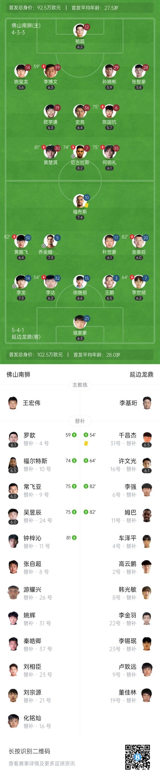 下半场补时5分钟,佛山龙狮2-2延边龙鼎。