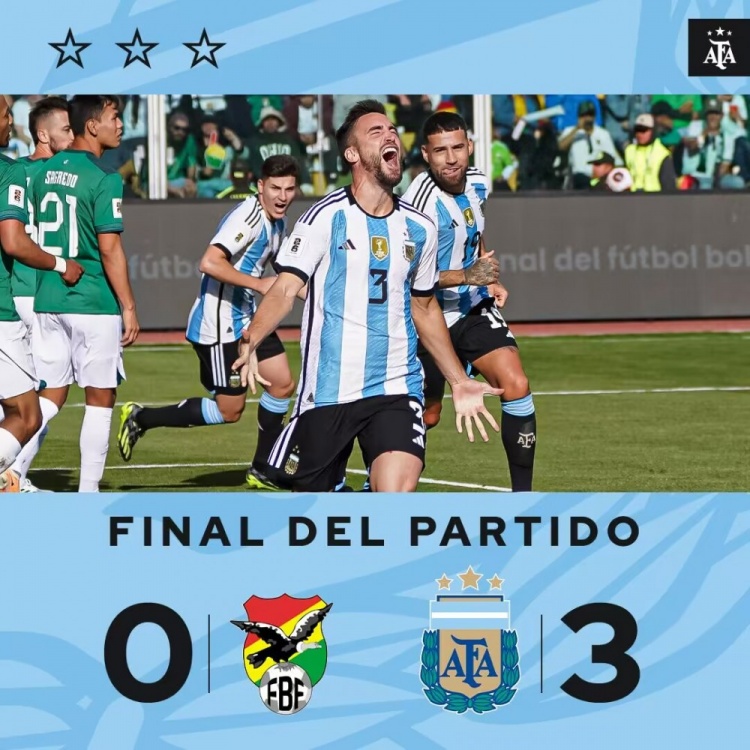 全场比赛结束,最终阿根廷3-0玻利维亚。