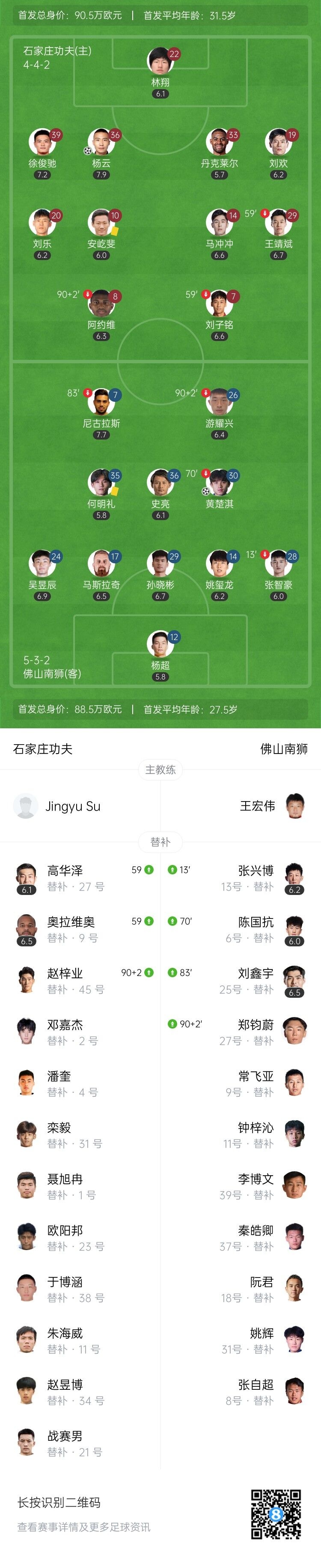 第53分钟,刘欢禁区内踢翻对手送点,尼古拉斯主罚命中!2-2!佛山南狮扳平了比分!↓