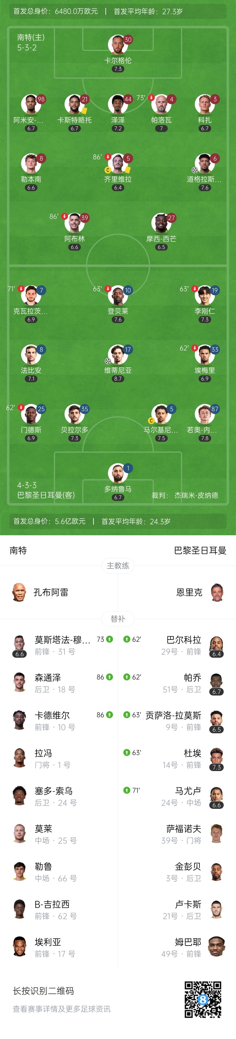 法甲10连胜终结!巴黎1-1南特30轮不败 维蒂尼亚破门阿什拉夫轮休