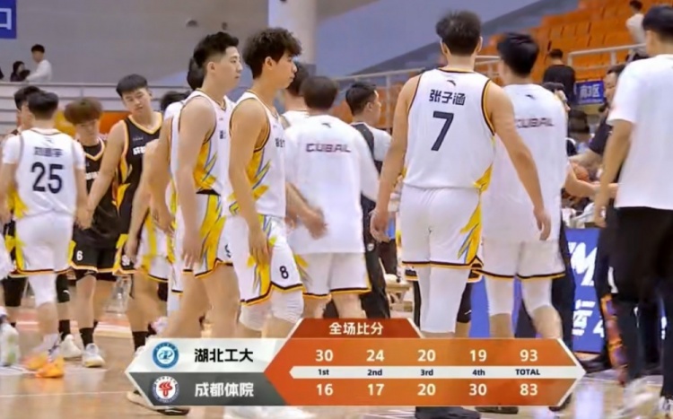 末节决战,张笑宁篮下强打2+1,随后阿木以合和拜全又相继扔进三分,成都体院一波小高潮追到差14分。胡景源三分紧急止血,崔耀如三分再进回应,双方继续展开拉锯战,黄浩杰三分再进再次领先到近20分。成都体院没有放弃,崔耀如连续命中两记三分,成都体院8-0追到差11分,但时间所剩无几,最终湖北工大93-83战胜成都体院。