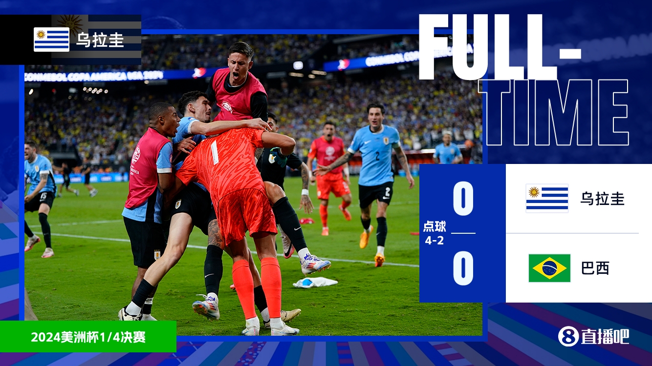 7月7日讯 北京时间7月7日9:00,美洲杯1/4决赛,乌拉圭对阵巴西。上半场努涅斯头球造险,阿劳霍伤退,拉菲尼亚失良机,巴西暂0-0乌拉圭;下半场南德斯直红,两队均未改写比分,90分钟两队0-0战平,比赛进入点球大战。点球大战中巴西第一个主罚的米利唐点球被扑,第三个主罚的道格拉斯-路易斯中柱,最终乌拉圭点球大战4-2战胜巴西,晋级四强。