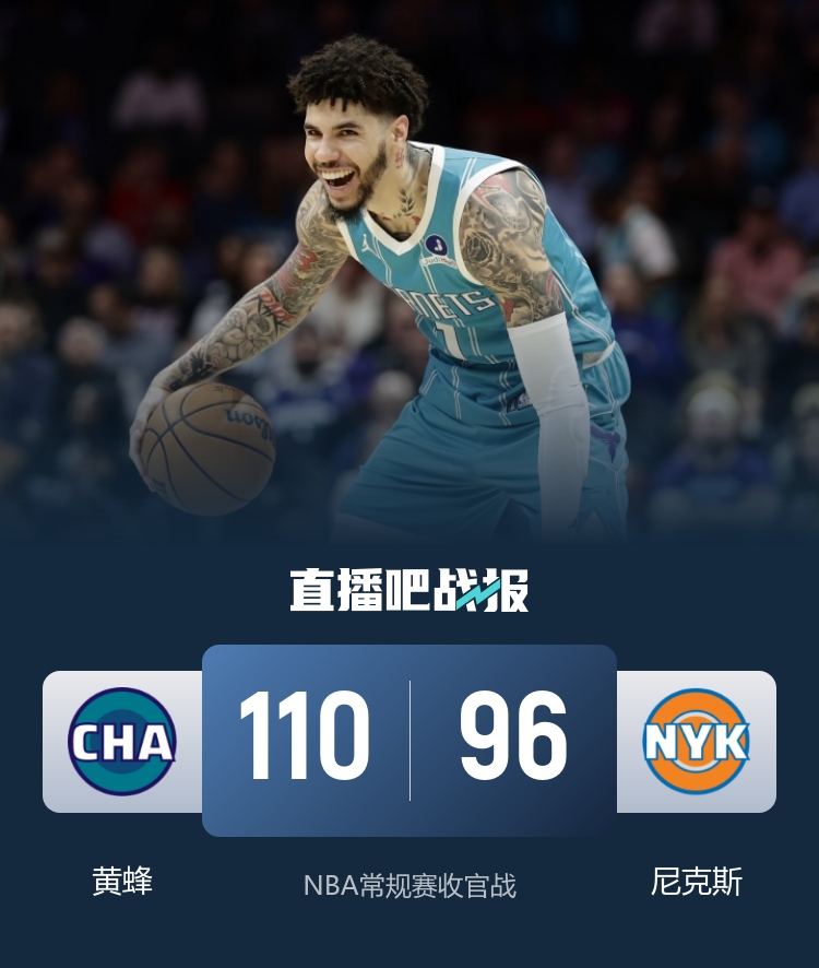 比赛开场,缺兵少将的尼克斯和黄蜂打的有来有回,麦克布莱德撑起球队进攻端发起重任,但随后轮换阵容上场后黄蜂还是拉开比分,怀特连得5分后黄蜂30-20结束第一节。次节回来,麦克布莱德延续状态,黄蜂这边鲍尔外线连续命中,两队交替取分,分差在10分上下浮动,半场结束黄蜂57-44领先。易边再战,两队展开对攻战,你来我往,分差没有被进一步缩小,三节结束黄蜂87-73领先。末节回来,鲍尔连续出手三分不中,随后换下场,比赛本身很快失去悬念,最终黄蜂110-96力克尼克斯。