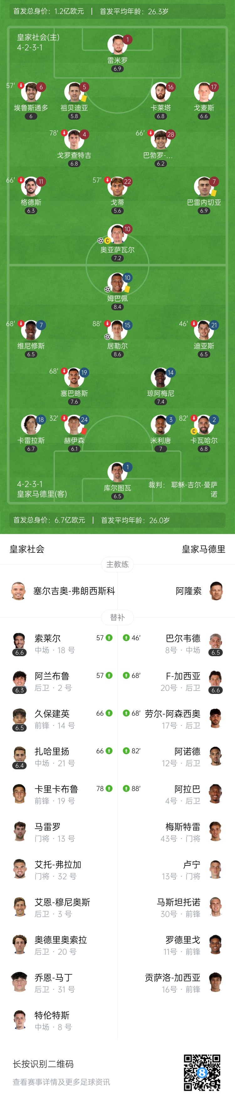 上半场伤停补时4分钟,半场结束,皇马暂2-0皇家社会。