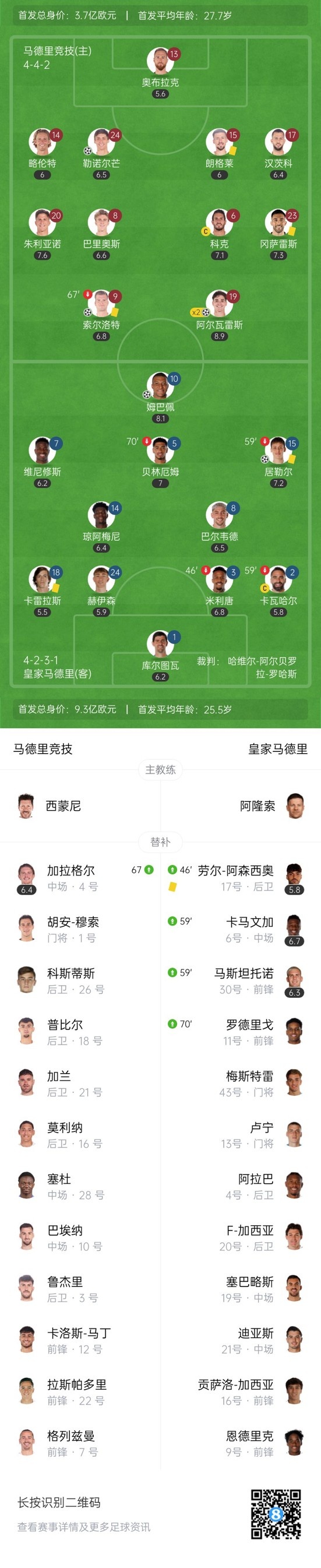 9月27日讯 北京时间9月27日22:15,西甲第7轮马竞迎战皇马的比赛在大都会球场进行,上半场索尔洛特开场失单刀,小西蒙尼助攻勒诺尔芒头球首开记录,居勒尔助攻姆巴佩单刀推射扳平比分,随后维尼修斯助攻居勒尔抽射反超比分,阿尔瓦雷斯远射中柱,补时索尔洛特头球扳平比分,半场结束,皇马2-2马竞。下半场居勒尔送点阿尔瓦雷斯点射破门,随后阿尔瓦雷斯任意球直接破门,格列兹曼替补建功,最终马竞5-2送皇马联赛首败,马竞收获两连胜。