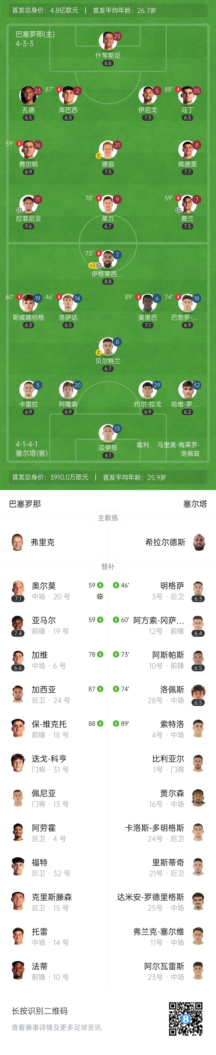 第68分钟,巴萨中路策动攻势过渡到右路,亚马尔送出传中,拉菲尼亚头球攻门得手,巴塞罗那3-3塞尔塔。↓