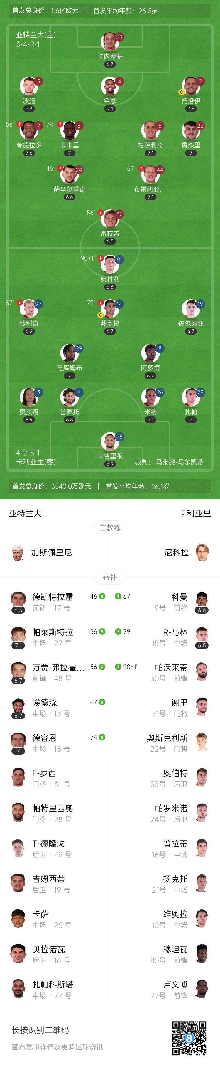 2月15日讯北京时间2月15日22时,意甲第25轮,亚特兰大坐镇阿祖里球场对阵卡利亚里。上半场,场面焦灼,双方都未能取得进球。半场战罢,亚特兰大暂0-0卡利亚里;下半场,布雷西亚尼尼破门被吹,亚特兰大用完所有换人名额加强进攻,可惜依旧未能取得进球。全场比赛结束,亚特兰大0-0卡利亚里!
